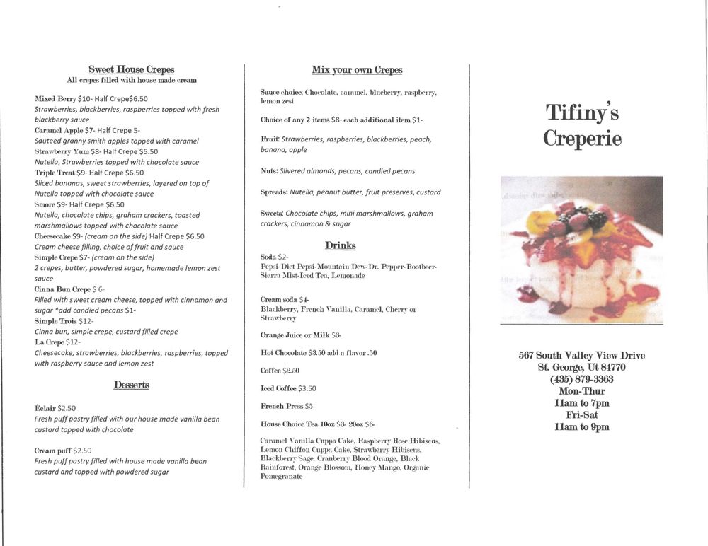 Introducing Tifiny's Creperie, a charming restaurant in St. George, UT, offering a delightful menu of sweet and savory crepes. The crepes are generously filled with a variety of mouth-watering ingredients like sweet cream cheese, fresh fruits, and decadent sauces. The Sweet House Crepes include options like the Cinna Bun Crepe, Simple Crepe, and Triple Treat Crepe, all bursting with flavor. For those who prefer customization, the Mix Your Own Crepes option allows you to choose your favorite fillings. Desserts like the Crepe Purse and Eclairs are the perfect sweet endings to your meal. Customers rave about the friendly staff, outdoor seating, and overall exceptional dining experience at Tifiny's Creperie. Don't miss out on this gem for a delicious and memorable meal.